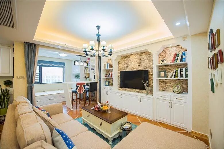 6、把電視機位置凹入,四周都是收納柜,干凈整潔的畫面,非常舒適輕松。