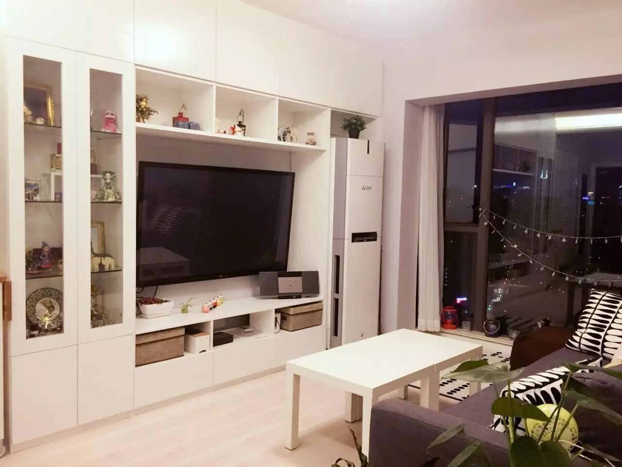 1、電視機在不看的時候,旁邊的推門拉過來擋住它,整個電視就顯得對稱又美觀簡潔。